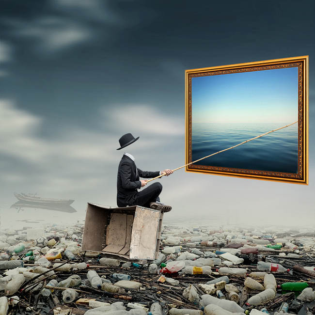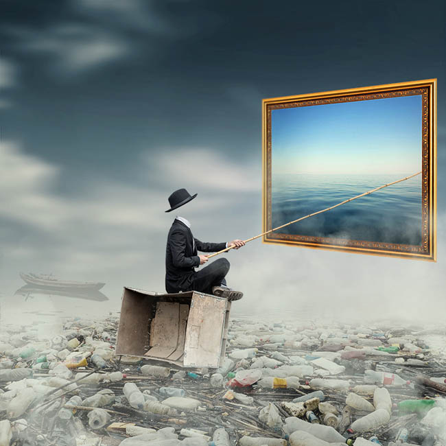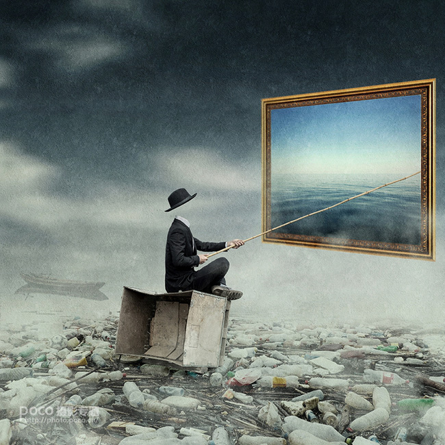 这是一个奇特引人深思的PS合作作品。作品原名《当下》,但寓意的是当下环境的继续恶化,终有一天我们也只能画中钓鱼了!作品奇幻,晦暗的天空、背景与画框中的蓝天碧水形成对比。没有脸部的垂钓人让画面显得更神秘。