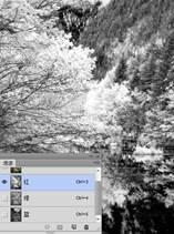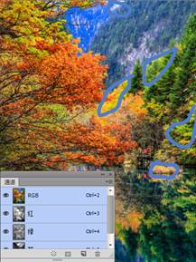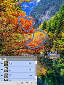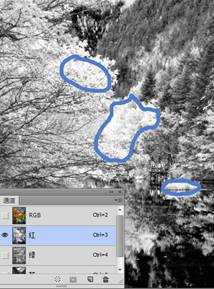 (3)现在单击红通道,回到红色通道中。然后带着问题“图中最亮的颜色是哪儿?它对应原来彩色图像中的是哪里”,反复单击红通道、RGB通道,在灰色图像与彩色图像中进行多次切换。说出你的答案,是否是“红通道中最白、最亮色的部位就是彩色图中红色树叶、亮黄色树叶(RGB模式中,黄色是由红色与绿色组成的)”?如图3所示。