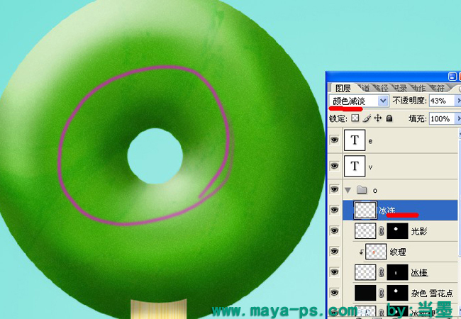 (15)如图15,新建图层命名为“冰冻”,把图层模式改为颜色减淡,然后用白色的大柔角笔刷在图示的圆圈上勾画一圈。这一步主要是制作正面冰冻的效果。