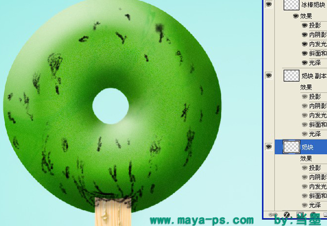 (17)新建图层命名为“奶块”,用画笔在上面画上一些斑点,如图17(有数位板的同学可以用数位板,那样效果更好。鼠标也行,不过辛苦点)。