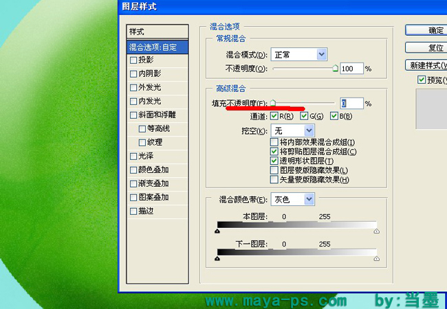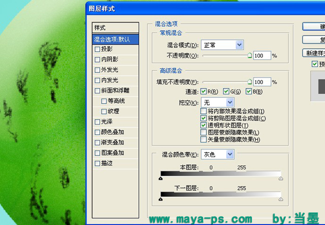 (18)下面开始制作冰冻的奶块效果啦。首先单击图层面板下的图层样式按钮,选择混合选项,弹出的对话框如图18。