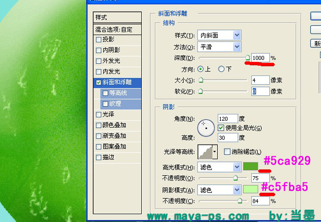 (20)为图层添加“斜面和浮雕”效果。高光颜色 #5ca929,阴影颜色#c5fba5,如图20。可以吸取做好的O字母上的颜色,可以不必用我的颜色数值。