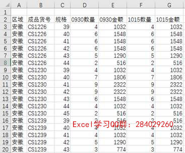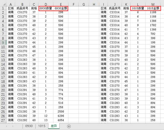 2、将“差异表”中的“数量”改为“0930数量”、“金额”改为“0930金额”。
