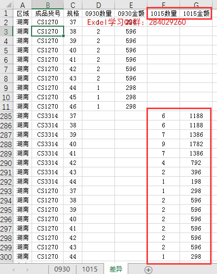 3、拖选第2张表“1015”中的A~E列,并复制,粘到差异表I列(与第1组数据空数据项数+1=3列),并将“数量”改为“1015数量”、“金额”改为“10150金额”: