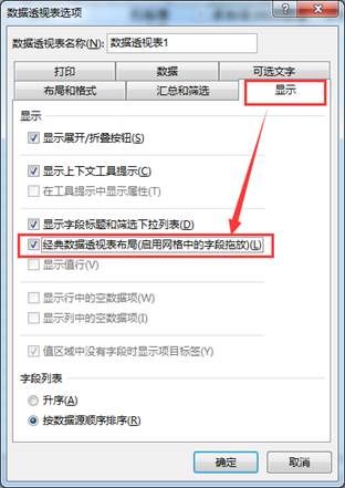 在弹出的界面里点“显示”标签项,勾选“经典数据透视表布局(启用网络格中的字段拖放)”并确定:
