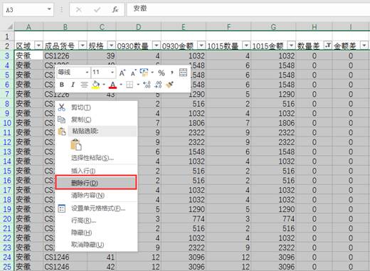 14、选择所有标题,加上自动筛选,筛选数量差和金额差均为“0”的行并选择筛选出的所有行号(点第1个筛选出的行,然后按Ctrl+Shift+光标向下键可一次选完)右键删除:
