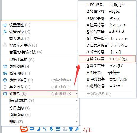 1、调出输入法右击,选择“软键盘——数字序号”。