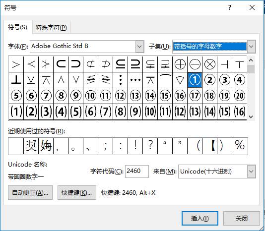 常用于输入包括20以内的带圈数字。系统自带的几种字体中包含有20以内的带圈数字,如“Adobe Gothic Std B”、“MSGothic”等等字体,因此,用户可通过插入“符号”输入20以内的带圈数字。