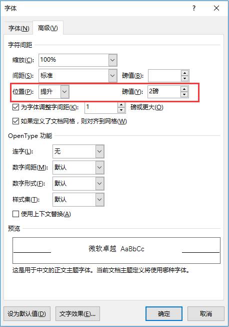 或是选择数字“88”,选择“开始”-“字体”,单击右下角的扩展按钮,打开“字体”对话框,选择“高级”选项卡,设置“位置”为提升,“磅值”为2磅,单击“确定”按钮。