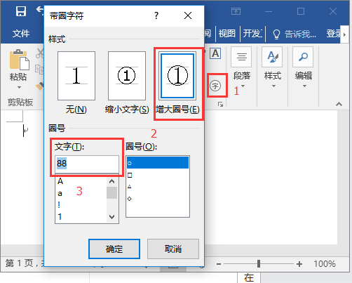 3、调整到合适大小后,再次按“Alt+F9"键,可看到调整后的带圈字符效果。