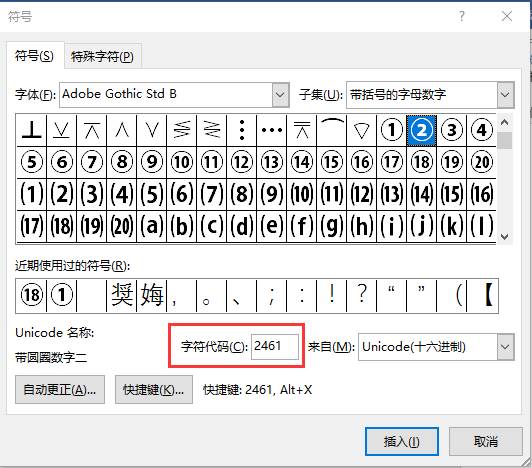 如,直接在文档中输入4位代码“2461”,选择代码,按Alt+X键即得到带圈字符。