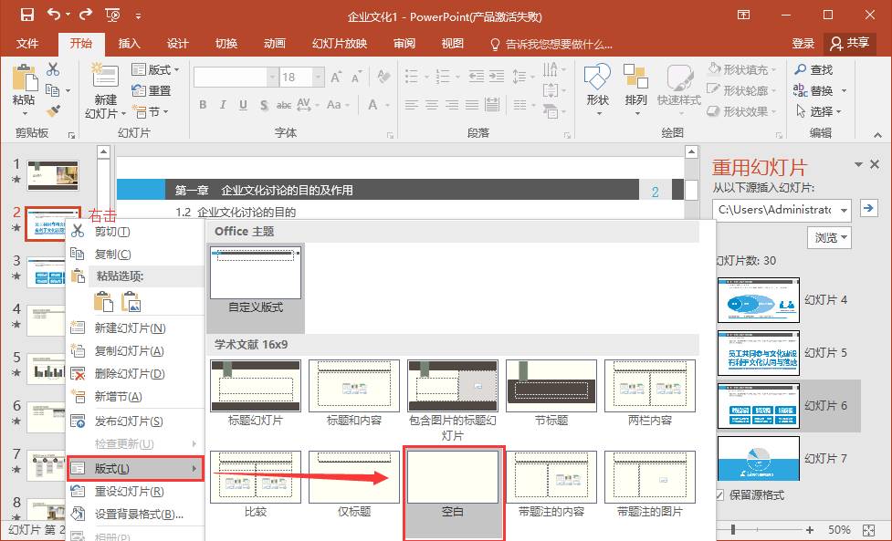 方法为:在幻灯片上单击鼠标右键,选择【版式】-【空白】,得到下图所示效果。