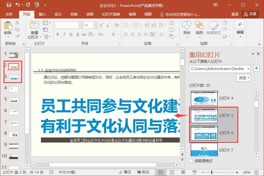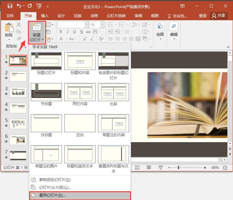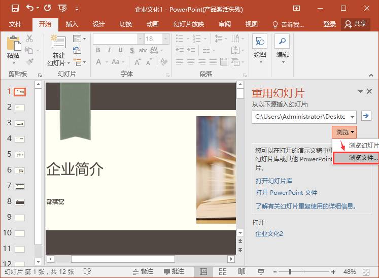 1、打开“企业文件1”演示文稿,选择第1张幻灯片(因为这里我们要在第2张幻灯片后面插入新的幻灯片),选择【开始】-【新建幻灯片】-【重用幻灯片】命令。