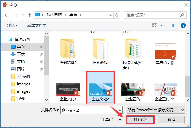 3、在弹出的“浏览”对话框中选择需要使用的PPT文件,这里选择“企业文化2”演示文稿,单击“打开”按钮。
