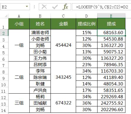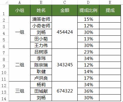 三个小组,每个小组每个人分配的金额不一样,要将金额按照每个人的提成比例核算出每个人的提成。