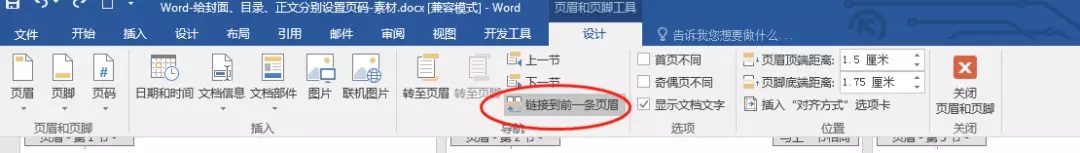 双击目录页的页脚区域,然后点击【设计】-【链接到前一条页眉】按钮取消页码的关联性。