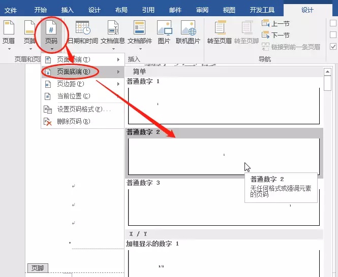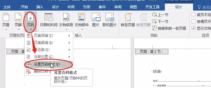 点击【设计】-【页码】-【设置页码格式】,在打开的“页码格式“对话框中设置编号格式及起始页码值等选项。