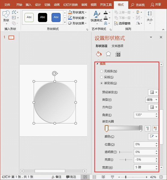 (3)为轮廓填充渐变色。展开下方的“线条”选项卡,选中“渐变线”单选按钮,然后设置形状渐变填充“类型”为“线性”,“方向”为“线性对角-右下到左上”,“角度”为“90°”,“渐变颜色”为“白色到灰色”,“宽度”为“5磅”,如下图所示。