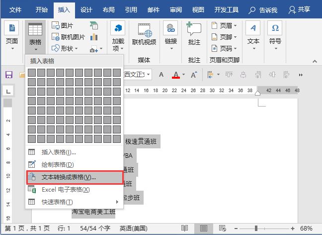 (1)选中文本,点击【插入】-【表格】按钮,在弹出的菜单中选择“文本转换为表格”命令。