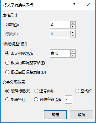 (2)打开“将文字转换成表格“对话框,在”列数“数值框中输入2,将其设置为2列,然后单击”确定“按钮。