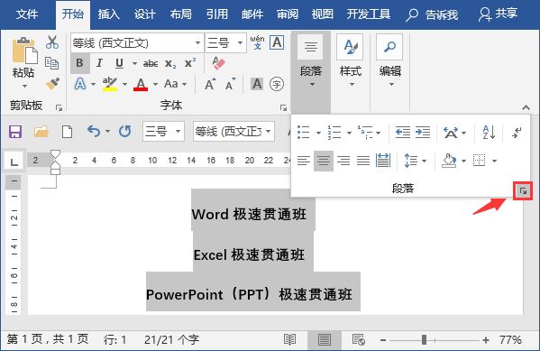 (1)选择所有的标题文本,点击【开始】-【段落】组右下角的扩展按钮。