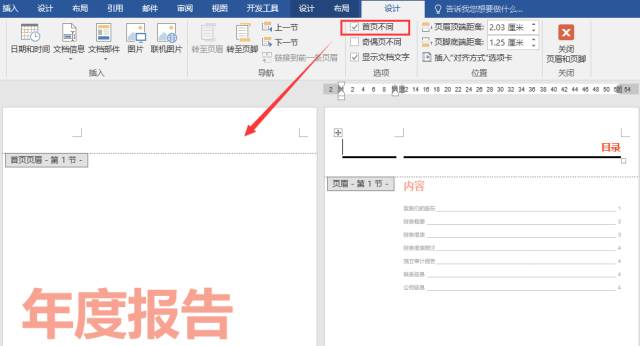 方法:设置完页眉页脚后,选择【设计】选项卡,勾选“首页不同”选项,删除首页页眉页脚内容即可。