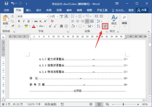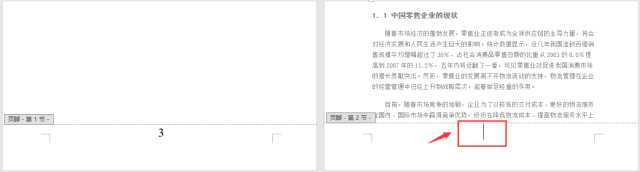 下面重点来了:这里需要使用分节符,将你要重新编页码的部分独立分出来。这里我们在目录与正文的绪论之间插入分节符,将文档分成两个部分。