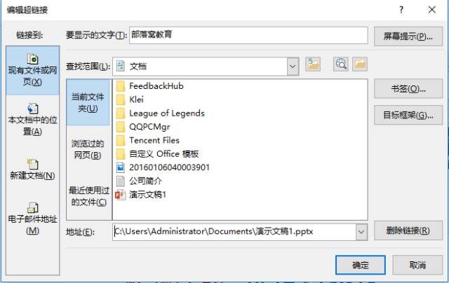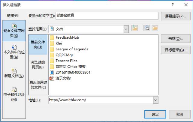 提示:Word中可选择链接的目标有多种,包括文档当前位置(文档内部之间的链接)、链接地址(网址、邮箱链接等)以及文档外的文件、程序链接。如,链接电脑中的PPT演示文稿,操作方法基本相似,这里不再赘述,小伙伴们快动手试一试吧!