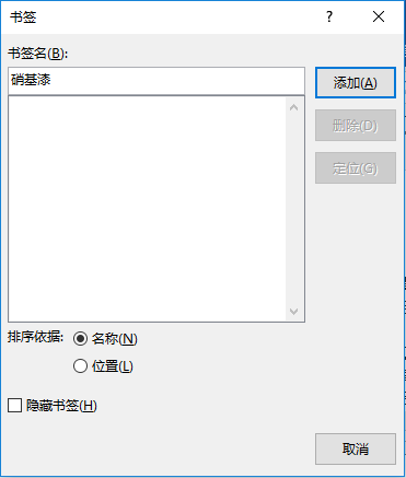 2、打开“书签”对话杠,输入“硝基漆“文字后,点击”添加“按钮,作为Word文档的标签。