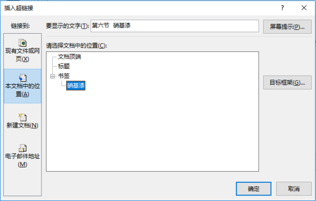 4、在打开的对话框中选择“本文档中的位置”,选中书签中的“硝基漆”标签,点击“确定”按钮。