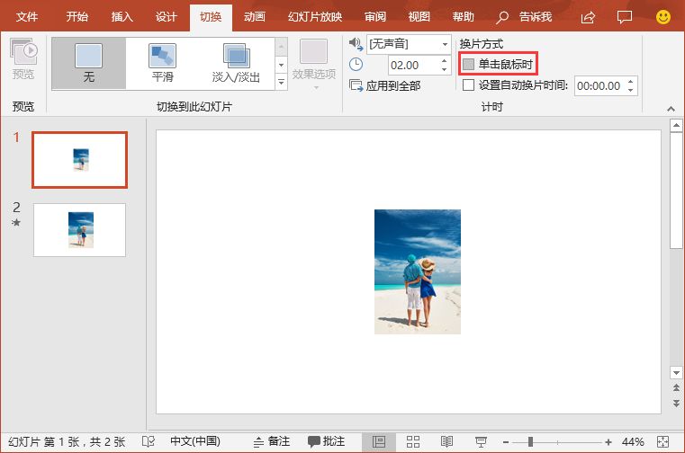 (4)选择第一张幻灯片,在【切换】-【计时】组中取消勾选“单击鼠标时”复选框。