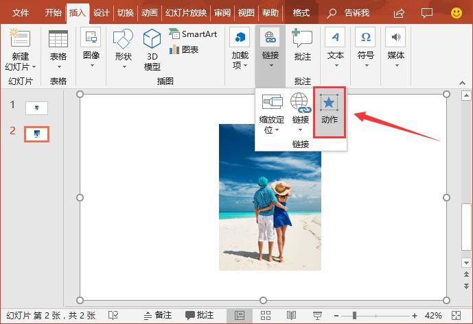 (5)再次选择第一张幻灯片中的图片,点击【插入】-【链接】-【动作】按钮。