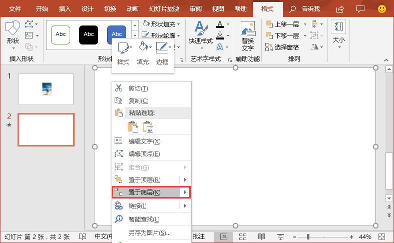 (9)选择第二张幻灯片,点击【插入】-【形状】按钮,选择“矩形”选项,绘制一个与页面相同大小的无边框白色矩形,然后右键,选择“置于底层”命令,将矩形放于图片下方。