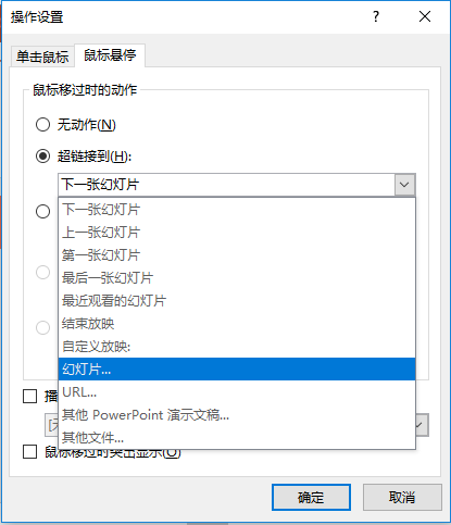 (11)打开“操作设置”对话框,选择“鼠标悬停”选项卡,选中“超链接到”单选按钮,在其下拉列表中选择“幻灯片...”选项。