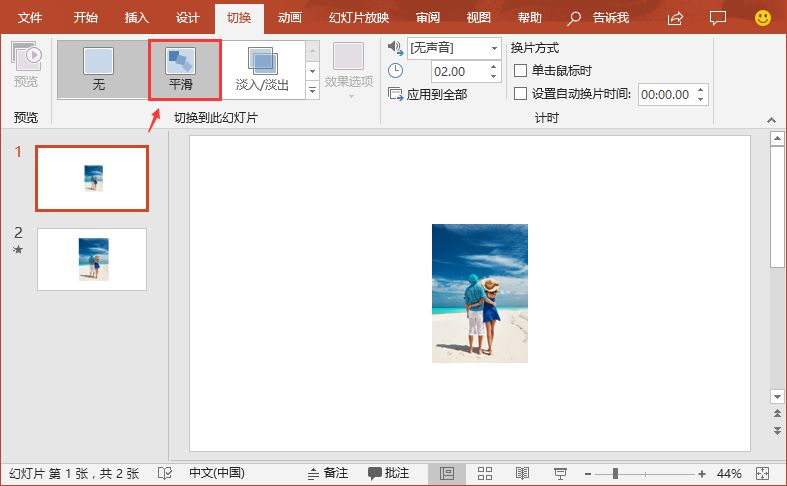 (3)选择第二张幻灯片,然后点击【切换】-【切换到此幻灯片】-【平滑】动画效果,为其添加平滑效果。