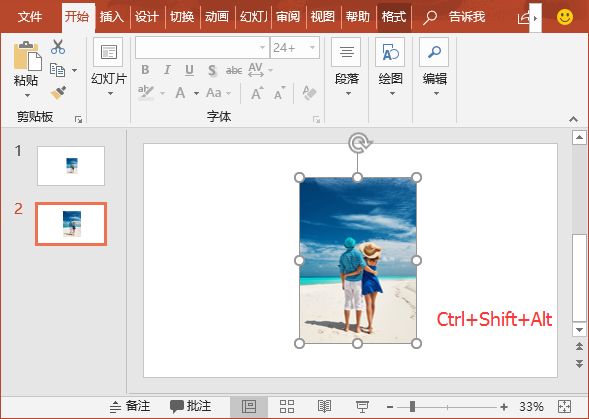 (2)选择第二张幻灯片中的图片,按住【Ctrl+Shift+Alt】键的同时,鼠标拖动图片,将图片等比例放大。