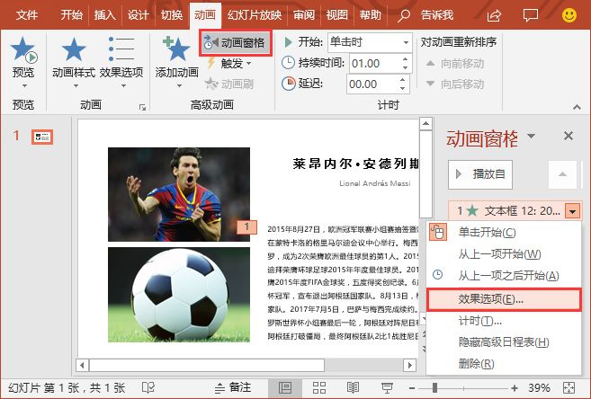 (2)点击【动画】-【高级动画】-【动画窗格】按钮,打开动画窗格,选中动画窗格中的这个动画选项,点击右侧的下拉按钮,在弹出的菜单中选择“效果选项”命令。