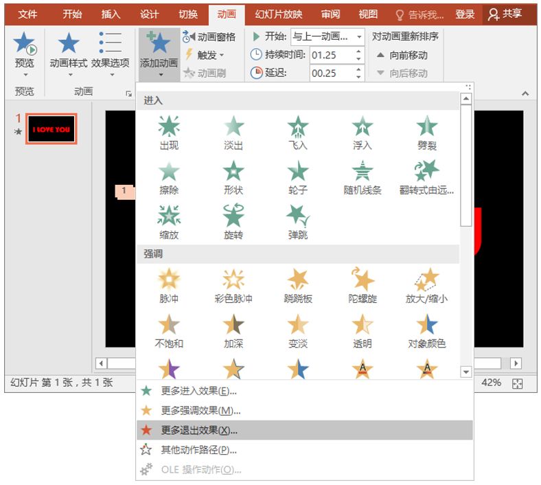 (7)再次点击【动画】-【添加动画】按钮,在弹出的菜单中选择“更多退出效果”命令,为文字添加一个退出动画。
