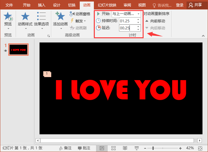 (9)在“计时”组中设置”开始“为”与上一动画同时“,“持续时间”为“01.25”,延迟为”00.25“。