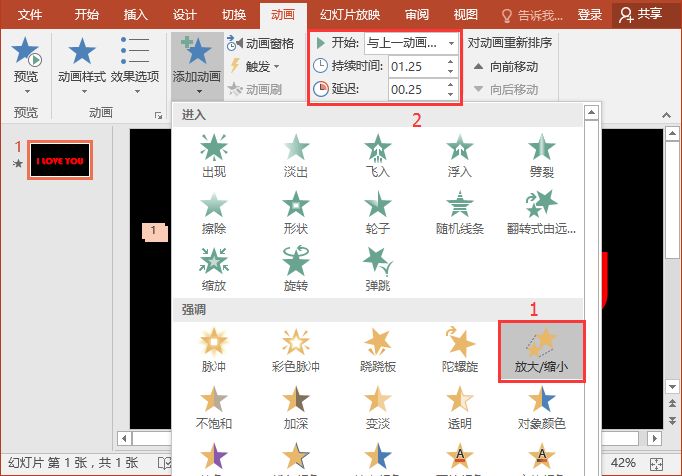 (4)再次点击【动画】-【添加动画】按钮,在弹出的菜单中选择【强调】-【放大缩小】动画效果,再设置”开始“为”与上一动画同时“,“持续时间”为“01.25”,延迟为”00.25“。