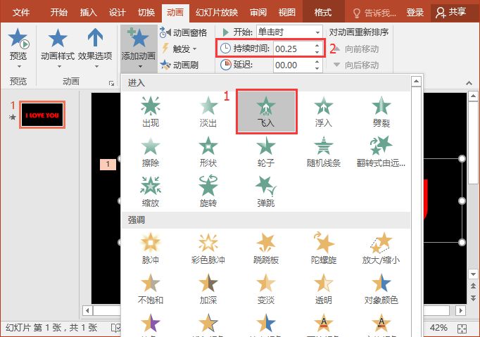 (3)选择文字,点击【动画】-【添加动画】按钮,在弹出的菜单中选择【进入】-【飞入】动画效果,然后设置“持续时间”为“00.25”。