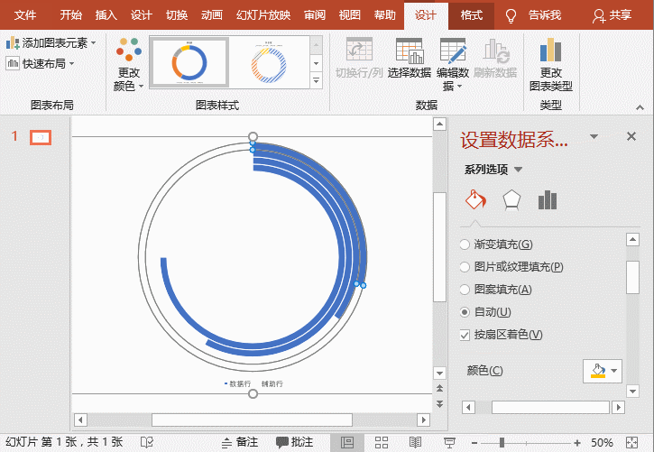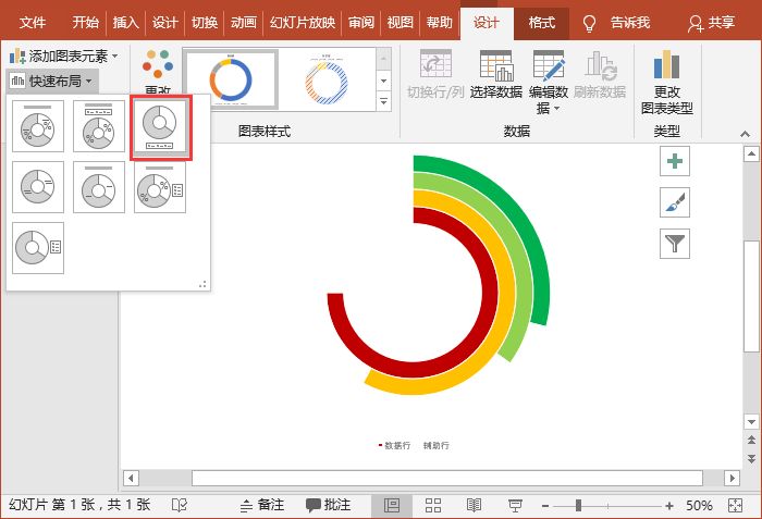 (6)选择图表,点击【图表工具】-【设计】-【图表布局】-【快速布局】按钮,在弹出的列表中选择”布局3“,加粗圆环图表线条。