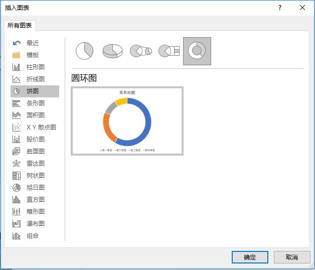 (1)点击【插入】-【插图】-【图表】按钮,打开”插入图表”对话框,选择“饼图”选项卡,选择“圆环图”,单击“确定”按钮插入一个圆环图。