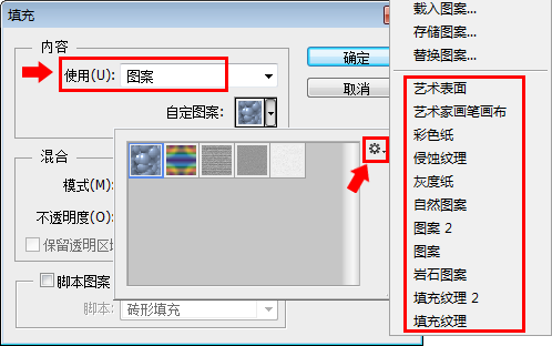 按Shift+F5键打开填充对话框,从使用内容中选择“图案”即可列出程序自带的各种预设图案,我们还可以从其预设面板的弹出菜单中选择更多的图案使用。