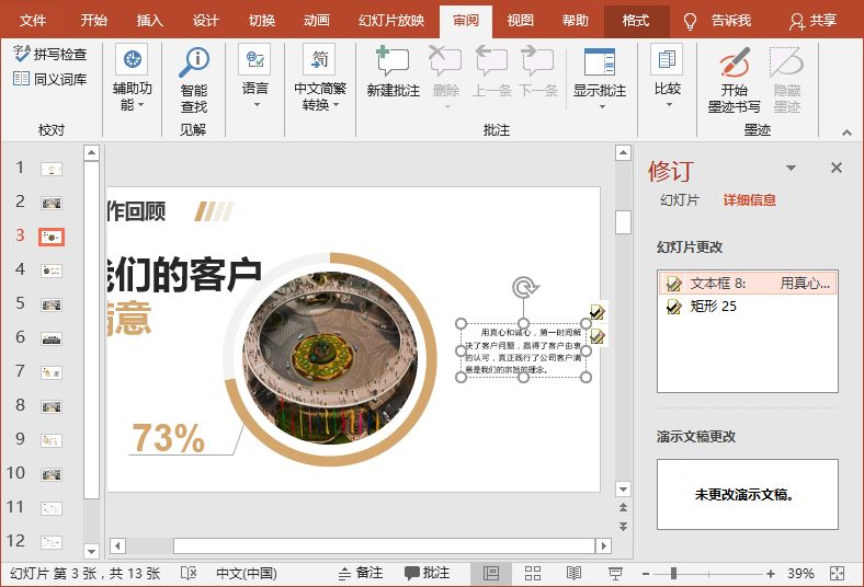 Step 2:打开修改后的文档,在界面最右侧出现了修订窗口,其中“幻灯片”更改框中显示了所有在当前页面内发生的更改;而“演示文档”更改框中则显示了整个文档中页数上的变化,此时,已进入自动对比模式,可以清晰的查看到修改痕迹,找到不同地方!