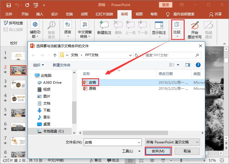 Step 1:在PPT中的比较文档时,我们首先需要打开原文档。然后点击【审阅】-【比较】按钮,在打开的对话框中选择修改后的文档,点击【合并】按钮。