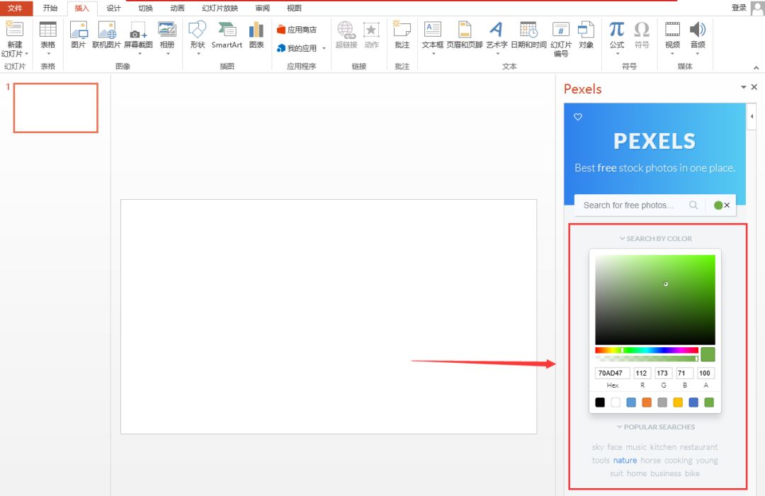 (2)返回工作界面,在右侧将打开“Pexels”任务窗格。如,可以先点击“SEARCH BY COLOR”,然后选择一种颜色作为搜索图片的色调。再点击“POPULARSEARCHES”,在下方选择搜索关键词,如sky(天空)、face(脸)、music(音乐)、nature(自然)等等选项。