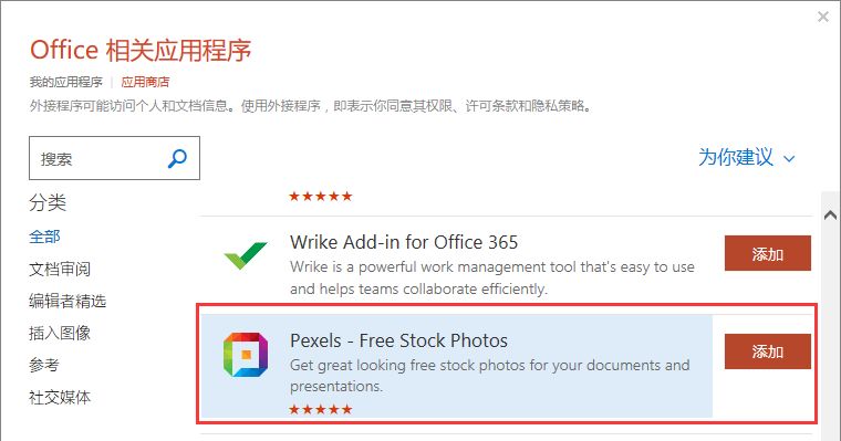 (1)点击【插入】-【加载项】-【应用商店】,打开“Office相关应用程序”面板,找到“Pexels”选项,点击“添加”按钮。