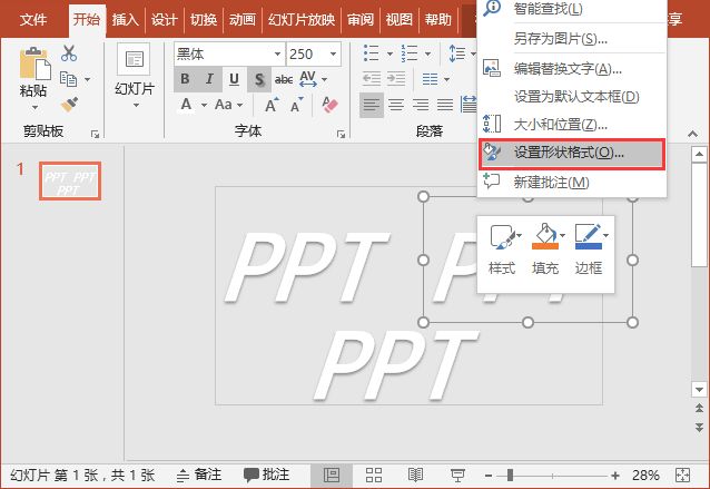 第四步:按住Ctrl键拖动文本框,复制两个相同文字。选择任一文本框,单击鼠标右键,在弹出的菜单中选择”设置文本格式“命令。