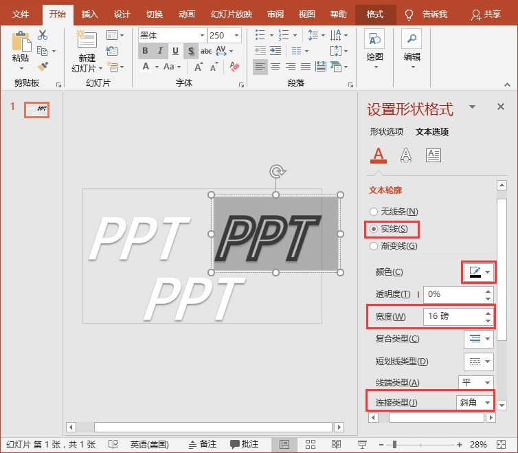 第五步:打开”设置形状格式“对话框,选择”文本选项“,在”文本轮廓“栏中选中”实线”单选按钮,然后设置颜色为“黑色”,宽度为“16磅”,连接类型为“斜角”,即得到黑色描边文字效果。